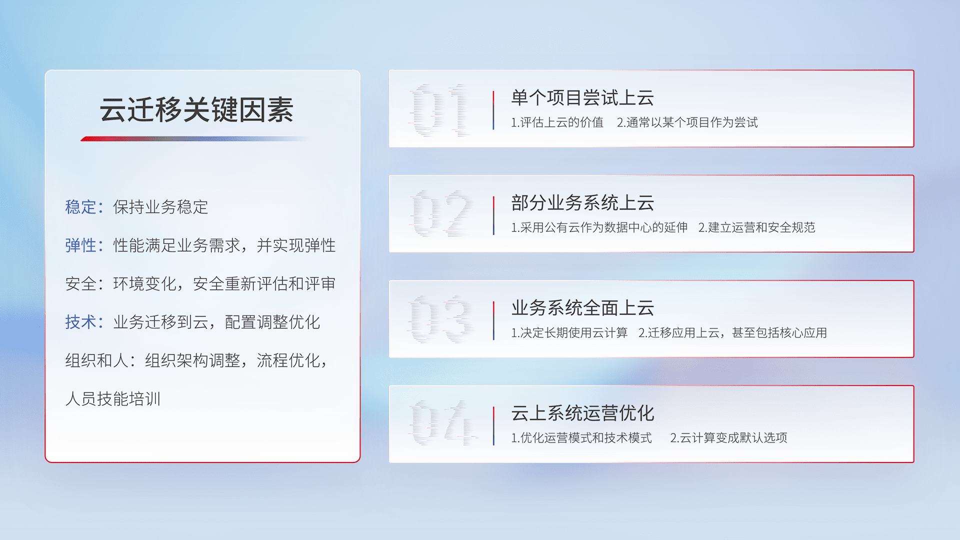 结合实际业务,,从规划设计、、、、云平台选型、、、、云原生改造、、数据迁移、、集成交付,,,迁移全过程为客户识别最佳上云路径,,,,做好风险识别管理,,设计网络架构、、、身份权限、、、、安全审计合规、、、、操作审计、、日志审计、、、监控告警策略、、、多站点容灾设计等,,对云上基础设施进行整体规划,,提升IT治理水平,,,,以满足弹性、、、高可用、、、、高性能的需求。。。。