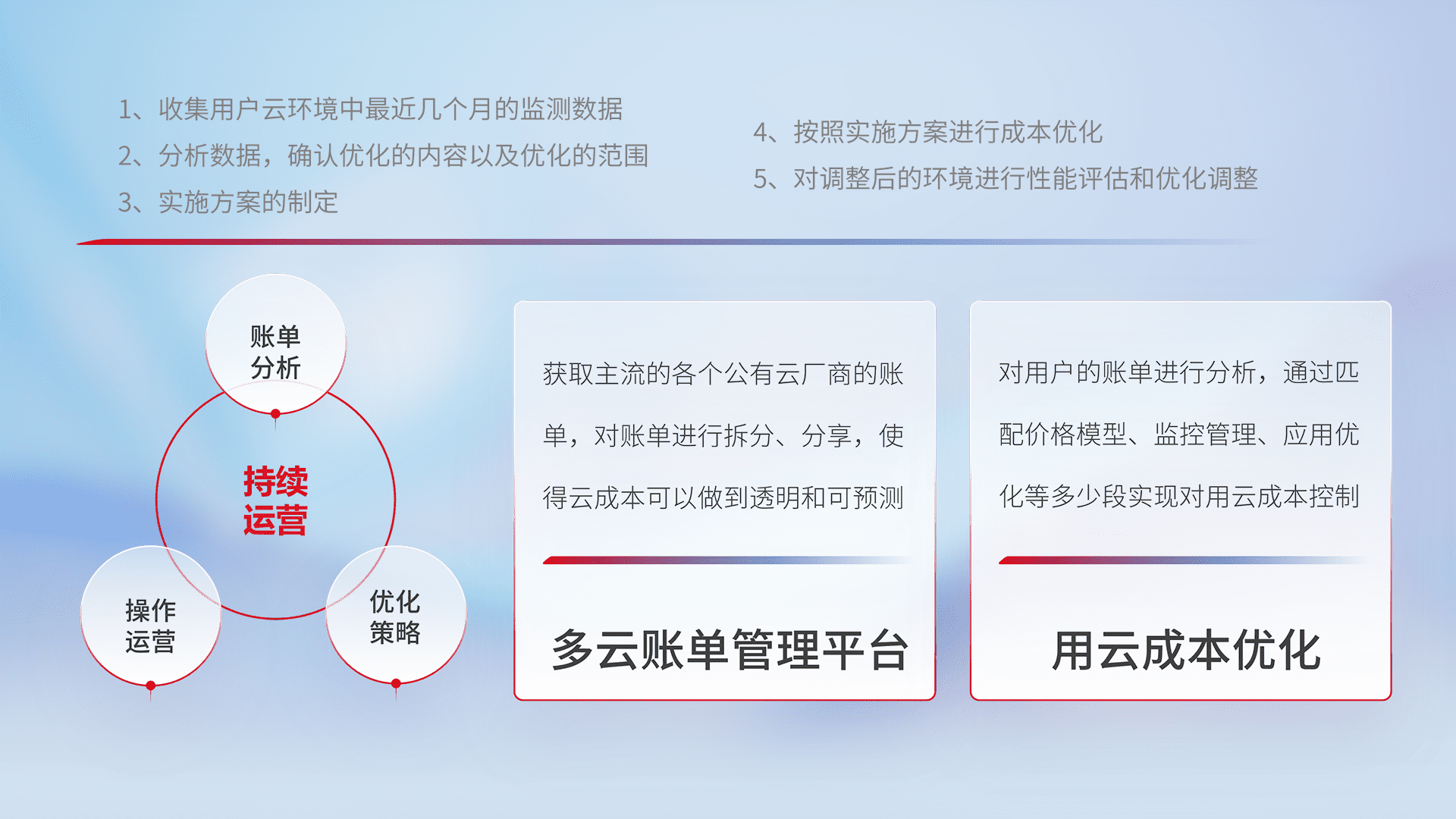 通过多云纳管,,,,以统一的资源数据模型把客户的云资源进行抽象和封装,,,,进而实现对多云资源的统一操作,,保障云资源管理的可靠性、、、稳定性与可用性。。量身定制化运维内容,,配置、、、、开发运维、、补丁管理、、、、备份、、、、监控、、、、认证和访问管理、、、、审计和日常巡检等,,,,保障在用云过程中的可靠度,,,,稳定度以及高可用率。。